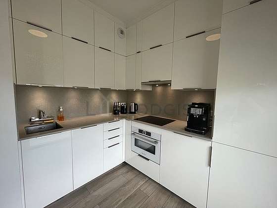 Este apartamento posee una cocina con parquet en el sueloy todo el equipamiento indispensable para su vida diaria : refrigerador, horno, cafetera, vajilla.