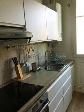 Este apartamento posee una bonito cocina con azulejo en el sueloy todo el equipamiento esencial para su vida diaria : placas eléctricas, refrigerador, congelador, horno, micro ondas, campana extractora, tostador, hervidor, cafetera, armario empotrado, vajilla, taburete, bar.