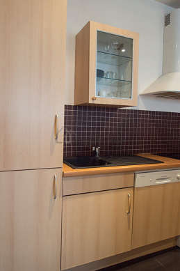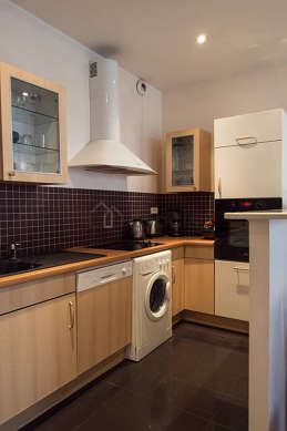 Este apartamento posee una magnífica cocina con parquet en el sueloy todo el equipamiento esencial para su vida diaria : placas eléctricas, refrigerador, congelador, horno, micro ondas, campana extractora, tostador, hervidor, cafetera, estantería, armario empotrado, vajilla, bar.