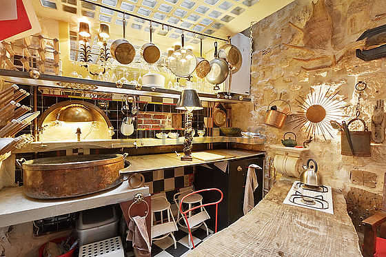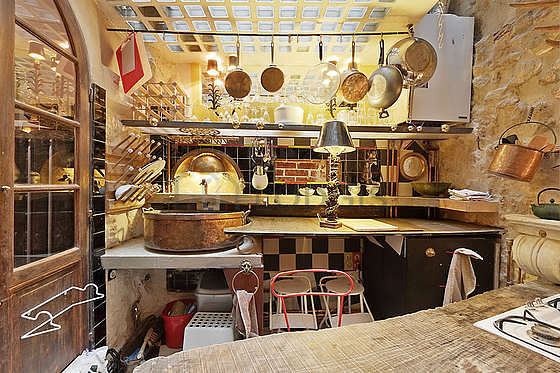 Este apartamento posee una bonito cocina con azulejo en el sueloy todo el equipamiento indispensable para su vida diaria : placas eléctricas, refrigerador, congelador, horno micro-ondas, tostador, mesa, estantería, aparador, vajilla, taburete.