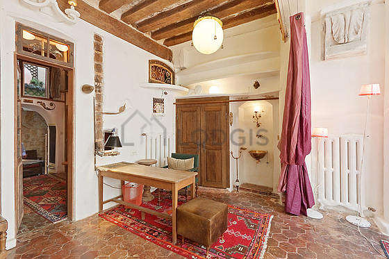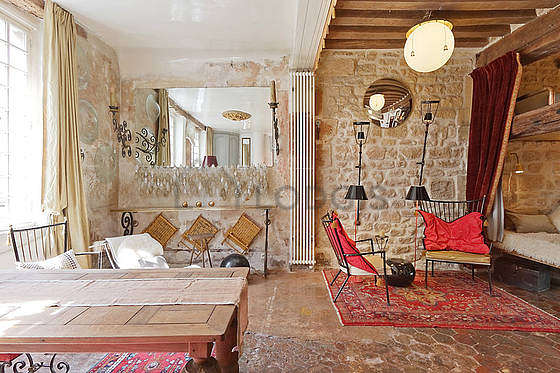 Este apartamento está formado por un salón con terrazo en el suelo y ventanas y una vista a la calle. Este salón está amueblado y equipado para que su estancia sea agradable : sábanas, edredones, 3 sillones, mesa, mesa de estudio, biblioteca, estantería, piedras aparentes, 4 silla(s)1 cama.