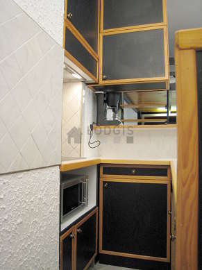 Este apartamento posee una bonito cocina con azulejo en el sueloy todo el equipamiento esencial para su vida diaria : placas eléctricas, refrigerador, micro ondas, congelador, tostador, hervidor, cafetera, armario empotrado, vajilla, taburete, bar.