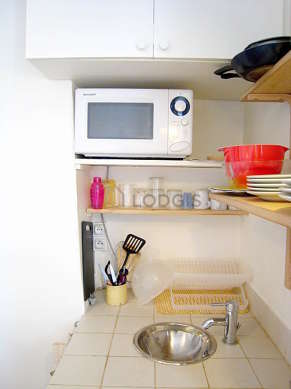 Este apartamento posee una cocina con coco en el sueloy todo el equipamiento necesario para su vida diaria : placas eléctricas, refrigerador, micro ondas, congelador, cafetera, estantería, vajilla.