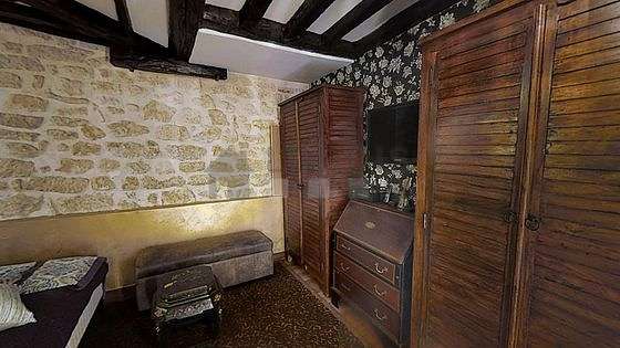 Este apartamento está formado por un salón con parquet en el suelo y ventanas doble acristalamiento y una vista a al patio. Este salón muy tanquilo está amueblado y equipado para que su estancia sea agradable : televisor, sábanas, edredones, mesita, mesa de estudio, ropero, armario, aparador, armario empotrado, piedras aparentes, viga, 1 silla(s), taburete1 cama.