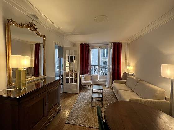 Este apartamento está formado por un salón con parquet en el suelo y ventanas y una vista a la calle. Este salón tranquilo está amueblado y equipado para que su estancia sea agradable : televisor, sábanas, edredones, 1 sillones, mesa, mesita, mesa de estudio, ropero, estantería, armario, cómoda, 2 silla(s)1 sofá cama.
