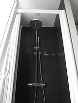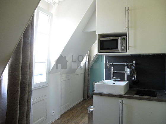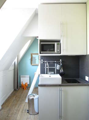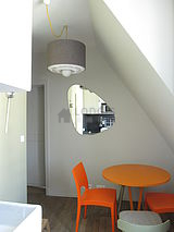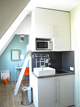 Este apartamento posee una bonito cocina con parquet en el sueloy todo el equipamiento esencial para su vida diaria : placas eléctricas, refrigerador, micro ondas, hervidor, cafetera, mesa, armario empotrado, vajilla, 2 silla(s), taburete.