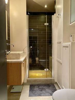 Este apartamento tiene una sala de baño magnífica. Este baño tiene todo lo necesario para su bienestar diario : toallas, armario empotrado, ducha, radiador seca-toallas. El WC está separado de la sala del baño y ubicado en un espacio independiente.