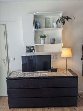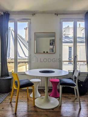 Este apartamento está formado por un salón con parquet en el suelo y ventanas y una vista a al patio. Este salón muy tanquilo está amueblado y equipado para que su estancia sea agradable : televisor, sábanas, edredones, mesa, estantería, cómoda, 2 silla(s)1 sofá cama.
