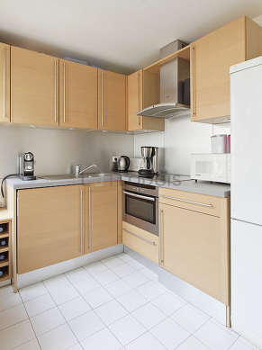 Este apartamento posee una magnífica cocina contiguo al salón con azulejo en el sueloy todo el equipamiento indispensable para su vida diaria : placas eléctricas, refrigerador, congelador, horno, micro ondas, campana extractora, tostador, hervidor, cafetera, armario empotrado, vajilla.