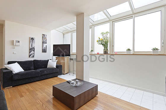 Este apartamento está formado por un salón con parquet en el suelo y ventanas doble acristalamiento y una vista a al patio. Este salón muy tanquilo está amueblado y equipado para que su estancia sea agradable : televisor, sofá, mesa, mesita, ropero, estantería, aparador, armario empotrado, 4 silla(s).
