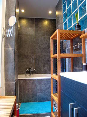 Este apartamento tiene una sala de baño agradable y clara with ventanas. Este baño tiene todo lo necesario para su bienestar diario : toallas, estantería, armario empotrado, bañera, secador de pelo, radiador seca-toallas. El WC está separado de la sala del baño y ubicado en un espacio independiente.