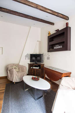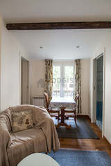 Este apartamento está formado por un salón con parquet en el suelo y ventanas doble acristalamiento y una vista a al patio. Este salón tranquilo está amueblado y equipado para que su estancia sea agradable : televisor, 2 sillones, mesa, mesita, 2 silla(s)1 cama infantil.