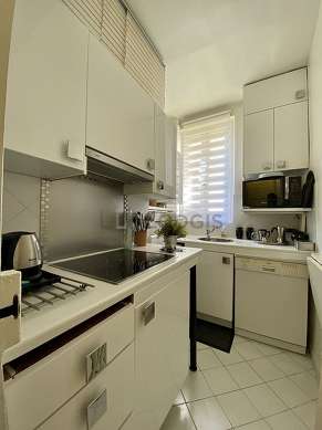 Este apartamento posee una bonito cocina con azulejo en el sueloy todo el equipamiento esencial para su vida diaria : placas eléctricas, refrigerador, congelador, horno micro-ondas, campana extractora, tostador, estantería, armario empotrado, vajilla, taburete.