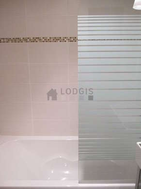 Este apartamento tiene una sala de baño agradable y clara. Este baño tiene todo lo necesario para su bienestar diario : toallas, estantería, bañera, secador de pelo, radiador seca-toallas. El WC está separado de la sala del baño y ubicado en un espacio independiente.