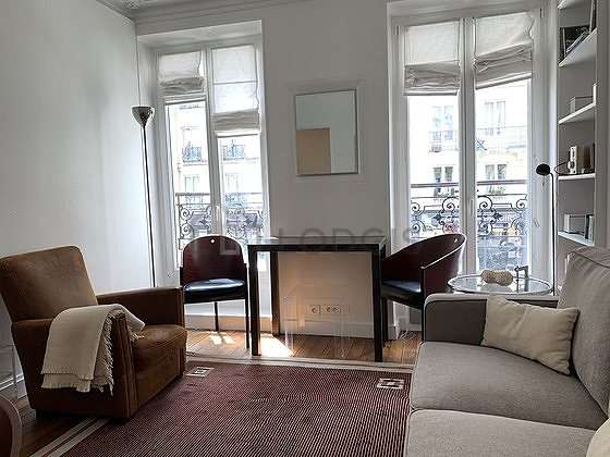 Este apartamento está formado por un salón con parquet en el suelo y ventanas doble acristalamiento y una vista a la calle. Este salón muy tanquilo está amueblado y equipado para que su estancia sea agradable : televisor, sofá, 3 sillones, mesa, biblioteca, 2 silla(s).