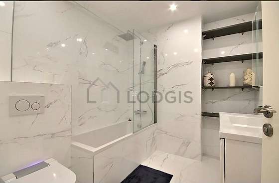 Este apartamento tiene una sala de baño magnífica. Este baño tiene todo lo necesario para su bienestar diario : toallas, armario empotrado, bañera, secador de pelo, radiador seca-toallas. El WC está integrado en la sala del baño.