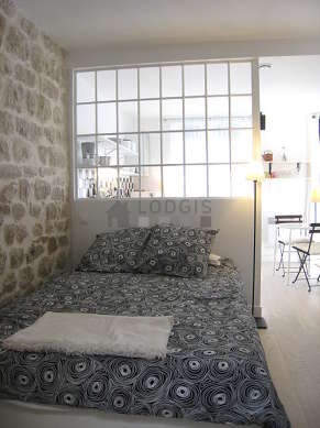 Este apartamento está formado por un salón con parquet en el suelo y ventanas doble acristalamiento y una vista a al patio. Este salón tranquilo está amueblado y equipado para que su estancia sea agradable : televisor, sábanas, edredones, 1 sillones, mesa de estudio, ropero, armario empotrado1 cama.