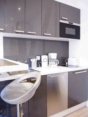 Este apartamento posee una bonito cocina con parquet en el sueloy todo el equipamiento necesario para su vida diaria : placas eléctricas, refrigerador, horno micro-ondas, tostador, hervidor, cafetera, armario empotrado, vajilla, taburete, bar.