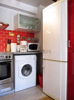 Este apartamento posee una bonito cocina contiguo al salón con azulejo en el sueloy todo el equipamiento indispensable para su vida diaria : placas eléctricas, refrigerador, congelador, horno, micro ondas, campana extractora, tostador, hervidor, cafetera, armario empotrado, vajilla.