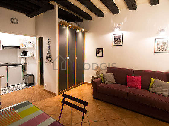 Este apartamento está formado por un salón con azulejo en el suelo y ventanas y una vista a al patio. Este salón muy tanquilo está amueblado y equipado para que su estancia sea agradable : televisor, sábanas, edredones, mesa, ropero, estantería, armario empotrado, viga, 4 silla(s), mesita de noche1 cama infantil, 1 sofá cama.