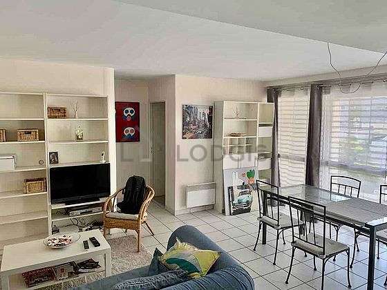 Este apartamento está formado por un salón con azulejo en el suelo y ventanas doble acristalamiento y una vista a al patio. Este salón muy tanquilo está amueblado y equipado para que su estancia sea agradable : televisor, 2 sillones, mesa, mesita, estantería, 6 silla(s).