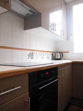 Este apartamento posee una magnífica cocina con azulejo en el sueloy todo el equipamiento esencial para su vida diaria : placas eléctricas, refrigerador, congelador, horno, campana extractora, tostador, hervidor, cafetera, estantería, armario empotrado, vajilla.