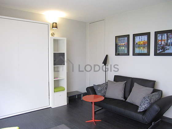 Este apartamento está formado por un salón con parquet en el suelo y ventanas y una vista a jardín. Este salón muy tanquilo está amueblado y equipado para que su estancia sea agradable : televisor, sábanas, edredones, sofá, mesa, mesita, ropero, estantería, cómoda, armario empotrado, 2 silla(s)1 armario cama.