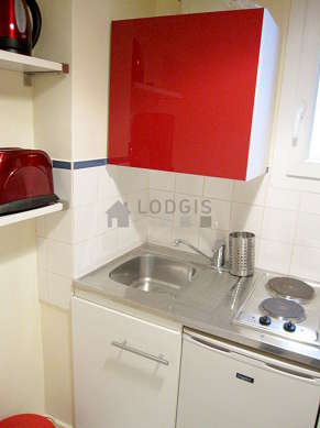 Este apartamento posee una cocina con azulejo en el sueloy todo el equipamiento esencial para su vida diaria : placas eléctricas, refrigerador, micro ondas, congelador, tostador, hervidor, cafetera, estantería, armario empotrado, vajilla.