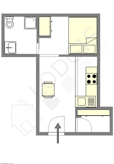 Este apartamento posee una magnífica cocina contiguo al salón con linoleum en el sueloy todo el equipamiento indispensable para su vida diaria : placas eléctricas, refrigerador, horno, micro ondas, congelador, campana extractora, tostador, hervidor, cafetera, estantería, vajilla.