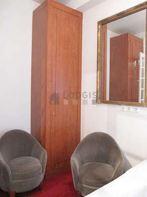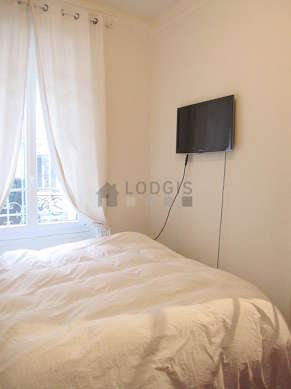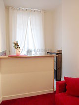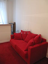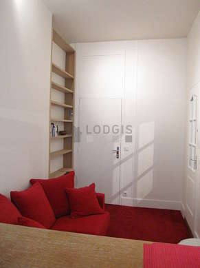 Este apartamento está formado por un salón con moqueta en el suelo y ventanas doble acristalamiento y una vista a la calle. Este salón tranquilo está amueblado y equipado para que su estancia sea agradable : sofá, estantería.