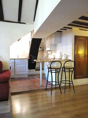 Este apartamento posee una cocina con azulejo en el sueloy todo el equipamiento esencial para su vida diaria : placas eléctricas, refrigerador, horno micro-ondas, congelador, tostador, hervidor, cafetera, estantería, armario empotrado, vajilla, 2 silla(s), bar.