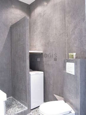 Este apartamento tiene una sala de baño agradable y clara. Este baño tiene todo lo necesario para su bienestar diario : toallas, estantería, armario empotrado, ducha. El WC está integrado en la sala del baño.