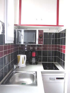 Este apartamento posee una bonito cocina con azulejo en el sueloy todo el equipamiento indispensable para su vida diaria : placas eléctricas, refrigerador, congelador, horno micro-ondas, tostador, hervidor, cafetera, mesa, armario empotrado, vajilla.