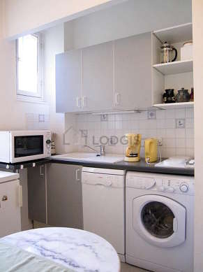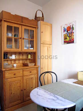 Este apartamento posee una bonito cocina con linoleum en el sueloy todo el equipamiento esencial para su vida diaria : placas eléctricas, refrigerador, horno micro-ondas, congelador, hervidor, cafetera, mesa, armario empotrado, vajilla, 2 silla(s).