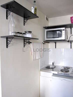 Este apartamento posee una bonito cocina con azulejo en el sueloy todo el equipamiento necesario para su vida diaria : placas eléctricas, refrigerador, horno, horno micro-ondas, congelador, tostador, hervidor, cafetera, estantería, armario empotrado, vajilla.