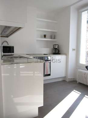 Este apartamento posee una bonito cocina con parquet en el sueloy todo el equipamiento esencial para su vida diaria : placas eléctricas, refrigerador, horno, horno micro-ondas, congelador, tostador, hervidor, cafetera, estantería, armario empotrado, vajilla, taburete, bar.