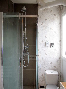 Este apartamento posee una bonito cocina con parquet en el sueloy todo el equipamiento necesario para su vida diaria : placas eléctricas, refrigerador, congelador, horno, micro ondas, campana extractora, tostador, cafetera, armario empotrado, vajilla.