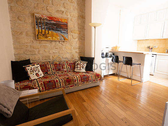 SalónEste apartamento está formado por un salón con parquet en el suelo. Este salón tranquilo está amueblado y equipado para que su estancia sea agradable : televisor, sábanas, edredones, sofá, 1 sillones, mesa, armario empotrado, 4 silla(s).