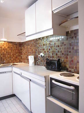 Este apartamento posee una cocina con azulejo en el sueloy todo el equipamiento esencial para su vida diaria : placas eléctricas, refrigerador, horno, micro ondas, congelador, tostador, hervidor, armario empotrado, vajilla, taburete.