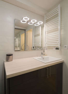 Este apartamento tiene una sala de baño magnífica y clara. Este baño tiene todo lo necesario para su bienestar diario : ropero, estantería, armario empotrado, bañera, sink, radiador seca-toallas. El WC está separado de la sala del baño y ubicado en un espacio independiente.