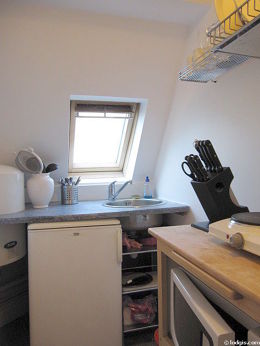 Este apartamento posee una cocina con parquet en el sueloy todo el equipamiento indispensable para su vida diaria : placas eléctricas, refrigerador, micro ondas, congelador, vajilla.