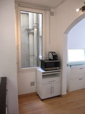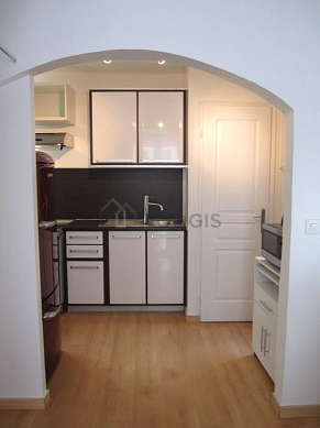 Este apartamento posee una cocina con parquet en el sueloy todo el equipamiento necesario para su vida diaria : placas eléctricas, refrigerador, congelador, campana extractora, tostador, armario empotrado, vajilla.