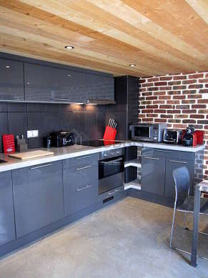 Este dúplex posee una magnífica cocina con cemento en el sueloy todo el equipamiento necesario para su vida diaria : placas eléctricas, refrigerador, congelador, horno, micro ondas, campana extractora, tostador, cafetera, mesa, armario empotrado, vajilla, 6 silla(s), taburete.