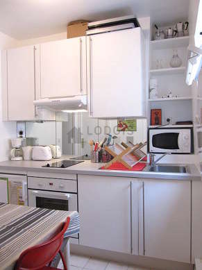 Este apartamento posee una bonito cocina con azulejo en el sueloy todo el equipamiento esencial para su vida diaria : placas eléctricas, refrigerador, horno, micro ondas, congelador, campana extractora, tostador, hervidor, cafetera, mesa, armario empotrado, vajilla, 2 silla(s).