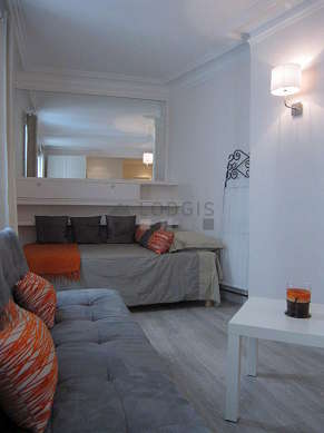 Este apartamento está formado por un salón con parquet en el suelo y ventanas doble acristalamiento y una vista a al patio. Este salón muy tanquilo está amueblado y equipado para que su estancia sea agradable : televisor, sábanas, edredones, mesita, estantería, armario, taburete, bar1 sofá cama, 1 cama.