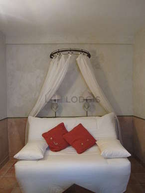 Con azulejo en el suelo y ventanas y una vista a al patio, esta habitación ofrece el equipamiento necesario para descansar durante su estancia : sábanas, edredones, mesa de estudio, estantería, 1 silla(s)1 sofá cama.