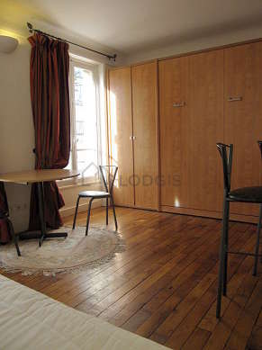 Este apartamento está formado por un salón con parquet en el suelo y ventanas y una vista a la calle. Este salón tranquilo está amueblado y equipado para que su estancia sea agradable : televisor, sábanas, edredones, mesa, ropero, armario, cómoda, armario empotrado, 2 silla(s), taburete, bar1 sofá cama, 1 armario cama.
