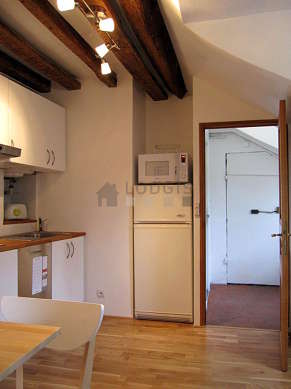Este apartamento posee una bonito cocina contiguo al salón con parquet en el sueloy todo el equipamiento indispensable para su vida diaria : placas eléctricas, refrigerador, congelador, horno micro-ondas, campana extractora, tostador, hervidor, cafetera, mesa, armario empotrado, vajilla, 4 silla(s).