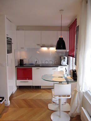Este apartamento posee una bonito cocina con parquet en el sueloy todo el equipamiento esencial para su vida diaria : placas eléctricas, refrigerador, horno, horno micro-ondas, campana extractora, tostador, hervidor, cafetera, mesa, armario empotrado, vajilla, taburete.