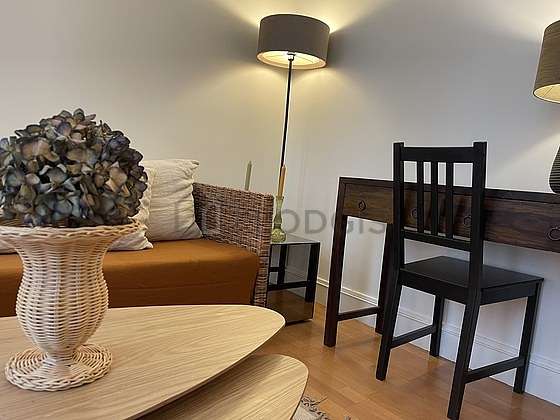 Este apartamento está formado por un salón con parquet en el suelo y ventanas y una vista a al patio. Este salón tranquilo está amueblado y equipado para que su estancia sea agradable : televisor, mesita, mesa de estudio, taburete1 sofá cama.